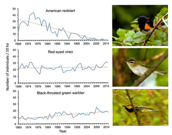 The total number of adult birds on the 10-ha study plot during the core breeding season has varied, peaking at 214 in 1972 and dropping to a low of 71 in 2002 (Figure 1). Despite considerable annual fluctuations, the bird population has remained relatively stable since the mid-1980s. Thus, the initial decline in bird abundance was a short-lived phenomenon. Furthermore, this decline was primarily driven by a few long-distance migratory species, including the American redstart, least flycatcher, and wood thrush, all of which have since disappeared from the 10-ha study plot. In contrast, other common species, such as the black-throated green warbler and red-eyed vireo, have increased in abundance through the years (Figure 2), while the populations of most species, like the black-throated blue warbler, have remained relatively stable (Table 1).