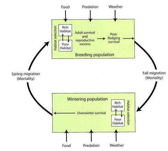 Figure 3. Conceptual model describing the factors and processes that influence bird populations in the breeding and wintering habitats