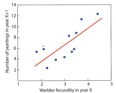 The overriding importance of breeding habitat quality in regulating migratory songbird populations emphasizes the key role of reproductive success in bird population dynamics. For example, the number of one-year-old individuals of several bird species on the 10-ha study plot is strongly correlated with reproductive success (fecundity—the number of young fledged per female) from the previous summer (Figure 4; Sillett et al. 2000). This remains true despite the numerous hazards faced by birds during their long migration and extended stay on their wintering grounds.