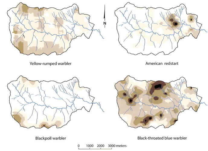 Figure 5. Maps illustrating the differing spatial patterns in the abundance of four bird species across the wider Hubbard Brook valley. Darker shades indicate higher abundances