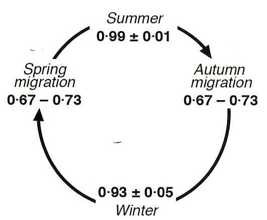 Observations of the demography of migratory songbirds during their stationary periods indicate that survivorship is very high, exceeding 90%. Yet, the annual survivorship of these birds typically ranges from 40% to 60%. This suggests that migration can be quite hazardous, leading to much lower survivorship during migratory periods. However, prior to the detailed studies of bird demography in habitats on both the breeding and non-breeding grounds at Hubbard Brook and Jamaica, respectively, little quantitative information on bird mortality during migration was available. The site fidelity of these birds during stationary periods has enabled calculations of bird survivorship across all four seasons (breeding, overwintering, spring migration, and autumn migration; Figure 6; Sillett and Holmes 2002). The hazards faced during migration include adverse weather conditions (severe storms, hurricanes), collisions with buildings, vehicles, communication towers, power lines, and turbines, predation by domestic cats, and the loss of suitable habitats for food and shelter along migratory stopover routes (Loss et al. 2014).